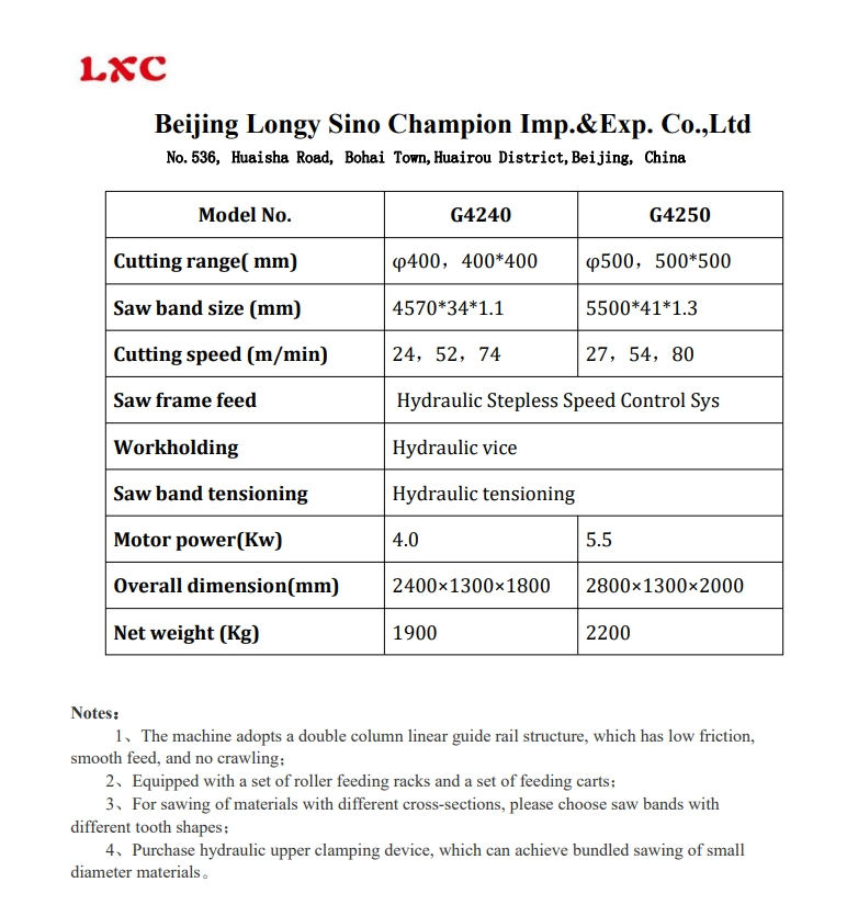 G4240 & G4250 pilla type horizontal band saw machine technical parameter